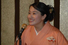 総勢40名、ご参加の皆様ありがとうございました。「けい子先生の浪曲」に会場は熱気であふれる大盛況でした。迫力満点!聴く人の魂を揺さぶり、心にじ〜んと来るものがあった気がします。「天狗の女房」・「両国夫婦花火」と一度に2本も聞かせて戴きありがたかったです。声と節回しと表情とがぴったり、目をつぶれば両国の花火情景が、しかも花火の色までもがくっきり浮かんで参りました。一風亭初月師匠の三味線の音色がこれまた何ともいいようのない心地よさを醸成し気分は最高でした。馴染みの薄かった「浪曲の世界」がいっぺんに身近に感じた気がします。けい子先生そして初月師匠、若いお二人の前途に乾杯!ありがとうございました。 |