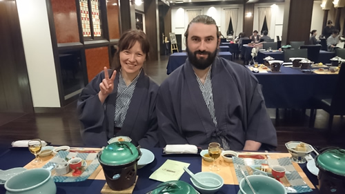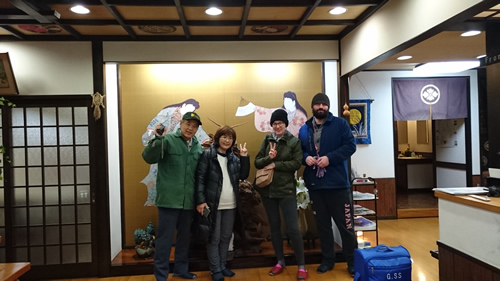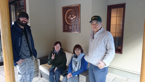 「多田屋ホテル前」で記念撮影、いよいよ今日で最後の1日です 。