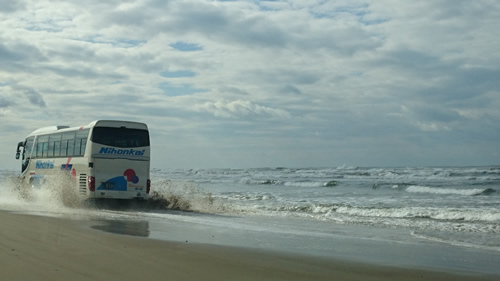 千里浜なぎさに「クレイジーバス」が波しぶきをあげて海の中に突っ込んでいきます。